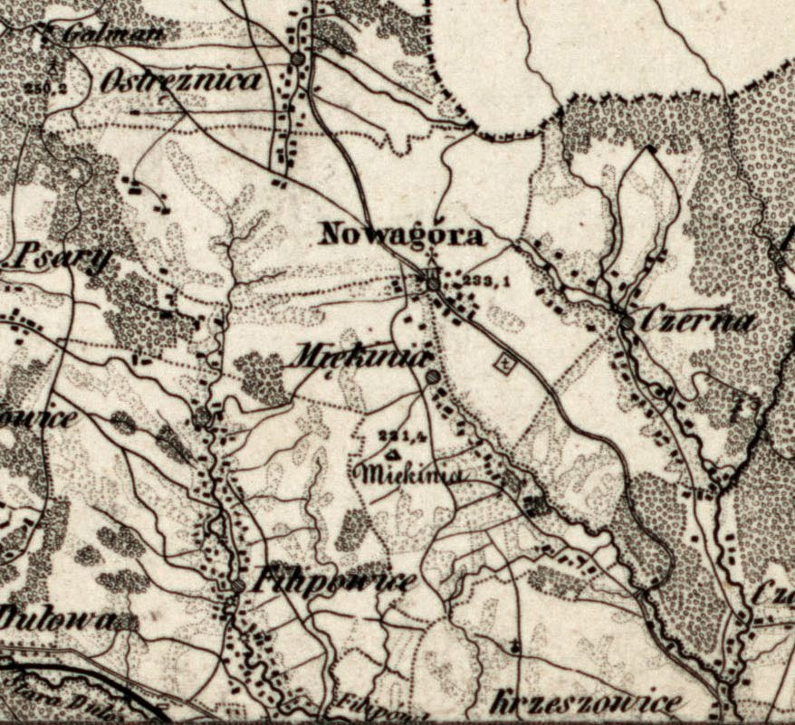 I jeszcze kilka map: pełna mapa z XVI wieku (przedstawia miejscowości "do góry nogami" tzn skierowana jest górą na południe, a nie na północ, dlatego też Chrzanów jest nie po lewej stronie Nowej Góry, a po prawej), z 1770, 1793, 1860 (Józef Herkner, Warszawa) i 1944 roku.